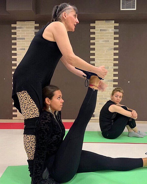Занятие по стретчингу начинается с разминки, чтобы разогреть мышцы и, тем самым, подготовить их к дальнейшим упражнениям. Далее работа стоя. Это достаточно динамичная часть занятия. Затем работа на ковриках, сидя или лежа. Включаю элементы проприоцептивной растяжки. Очень хороший результат дает парная растяжка, поэтому часто на занятиях по стретчингу работаем в парах!